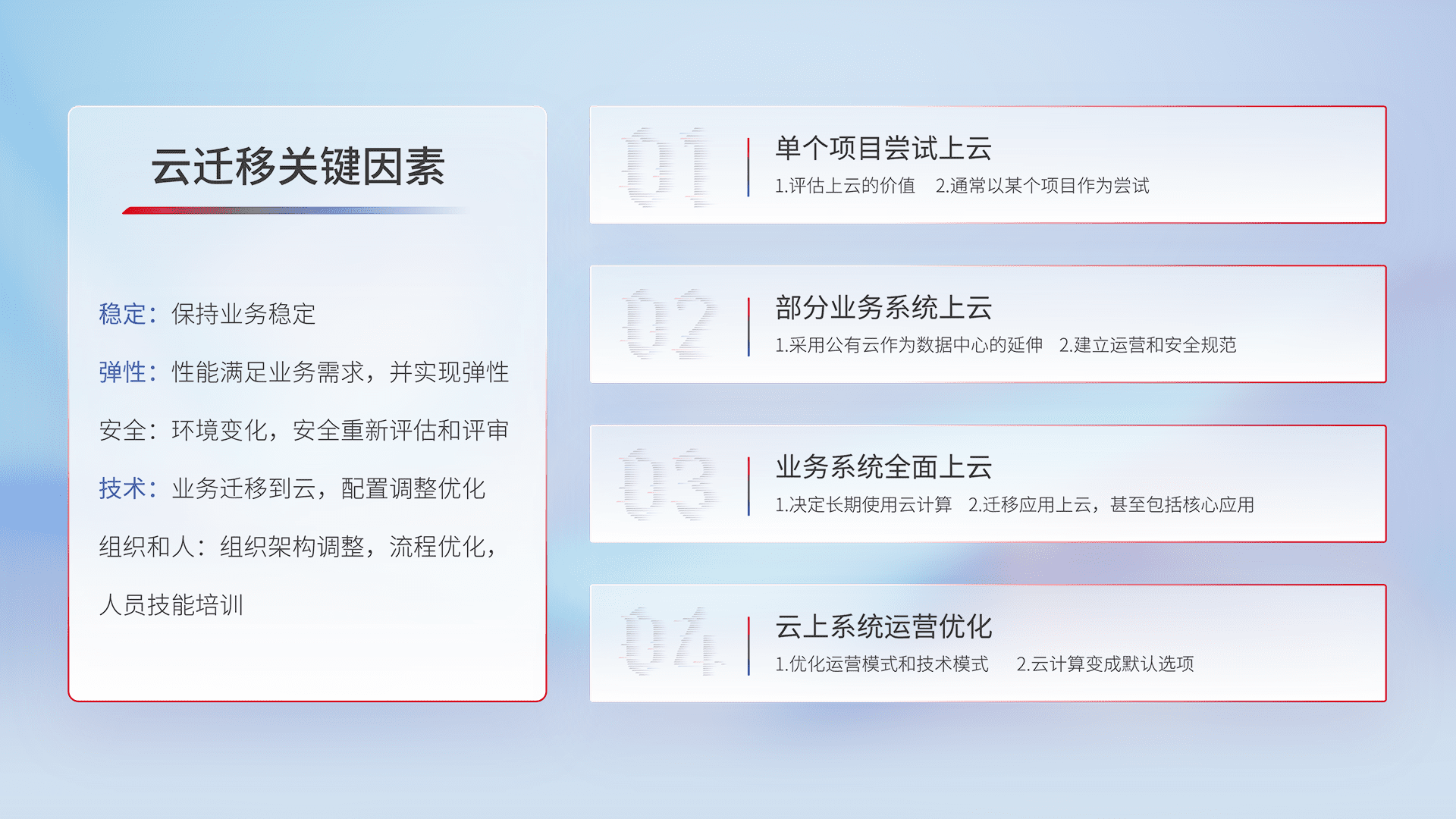 结合实际业务,,从规划设计、、、云平台选型、、云原生改造、、数据迁移、、、、集成交付,,,,迁移全过程为客户识别最佳上云路径,,,,做好风险识别管理,,,,设计网络架构、、、、身份权限、、安全审计合规、、操作审计、、、日志审计、、监控告警策略、、、、多站点容灾设计等,,,对云上基础设施进行整体规划,,提升IT治理水平,,,,以满足弹性、、高可用、、高性能的需求。。。。
