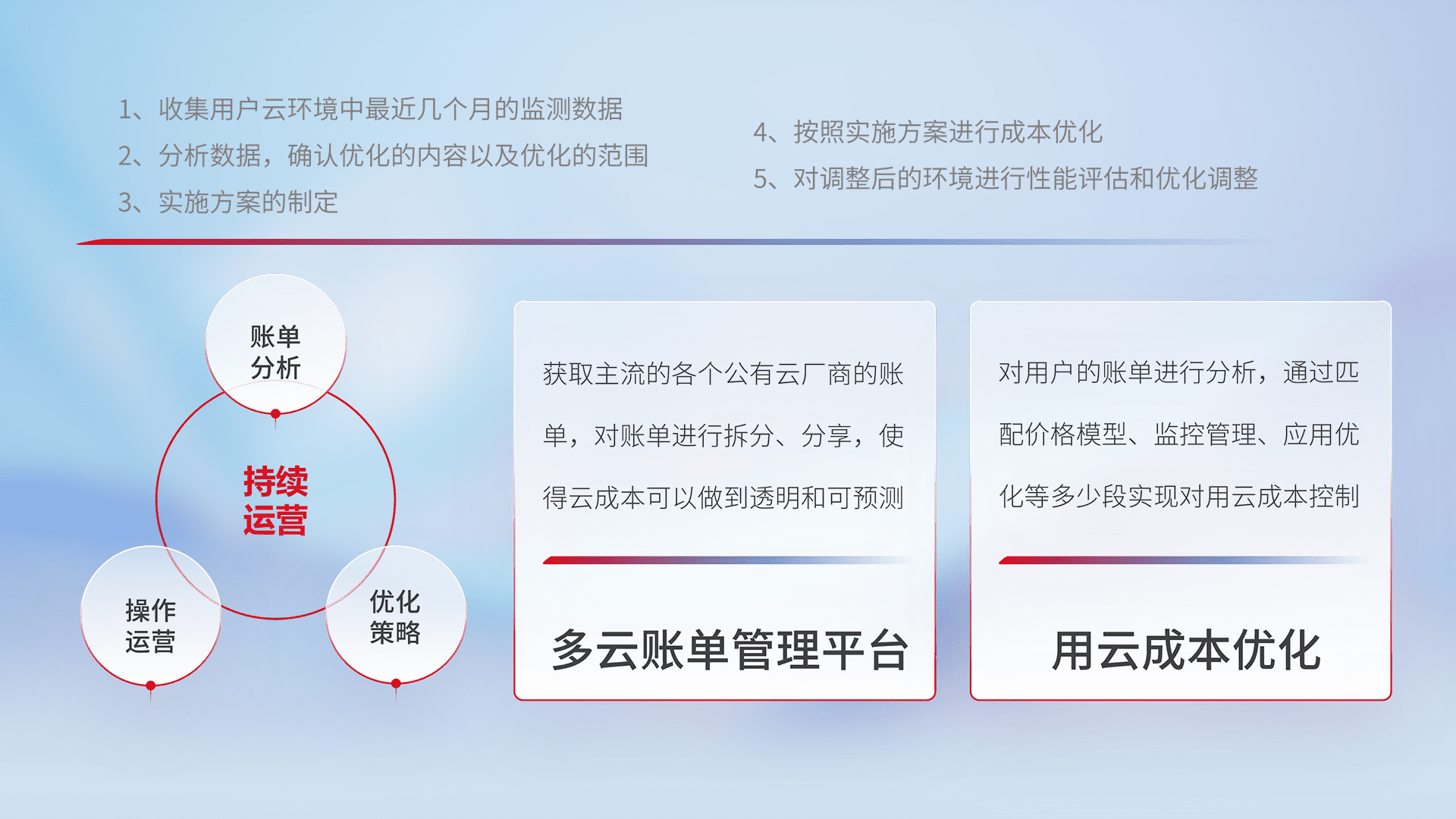 通过多云纳管,,以统一的资源数据模型把客户的云资源进行抽象和封装,,,进而实现对多云资源的统一操作,,,保障云资源管理的可靠性、、稳定性与可用性。。。量身定制化运维内容,,,配置、、、开发运维、、、补丁管理、、、备份、、、监控、、认证和访问管理、、、审计和日常巡检等,,,,保障在用云过程中的可靠度,,稳定度以及高可用率。。。